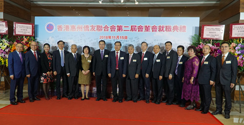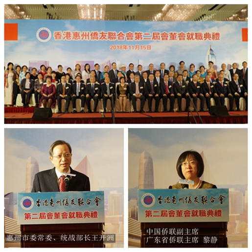 ??? 11月15日,香港惠州僑友聯(lián)合會(huì)第二屆會(huì)董會(huì)就職典禮在香港舉行。香港中聯(lián)辦副主任何靖,全國人大常委、香港惠州社團(tuán)聯(lián)合總會(huì)首席會(huì)長譚耀宗,中國僑聯(lián)副主席、廣東省僑聯(lián)主席黎靜,香港中聯(lián)辦社團(tuán)聯(lián)絡(luò)部副部長黎寶忠,香港中聯(lián)辦九龍工作部副部長劉國強(qiáng),惠州市委常委、統(tǒng)戰(zhàn)部長王開洲,仲愷高新區(qū)委常委、區(qū)黨群辦主任陳智明等領(lǐng)導(dǎo)和嘉賓出席典禮。惠州市僑聯(lián)主席劉云應(yīng)邀出席活動(dòng),并與各界嘉賓、居港惠州僑友共600余人歡聚一堂,共慶新一屆會(huì)董會(huì)就職。?