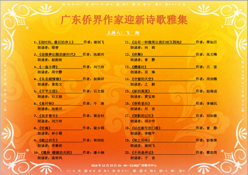 ??? 廣東省僑界作家聯(lián)合會(huì)張文峰會(huì)長(zhǎng)說:在新年的腳步聲越來越近的時(shí)候,我們舉辦“廣東僑界作家迎新詩歌雅集”活動(dòng),是具有歷史意義的。今年是我國改革開放四十周年,在慶祝我國改革開四十周年大會(huì)上,習(xí)近平總書記發(fā)出號(hào)召,要我們“不忘初心,牢記使命,將改革開放進(jìn)行到底”。我們聽了以后,很振奮!隨著改革開放不斷地深化,我們的明天會(huì)更好!