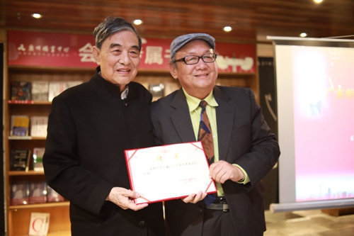 ??? △廣東省僑界作家聯(lián)合會(huì)原副會(huì)長(zhǎng)、廣東省文學(xué)院原副院長(zhǎng)、一級(jí)作家沈仁康先生(左)接受張文峰會(huì)長(zhǎng)(右)頒發(fā)的廣東省僑界作家聯(lián)合會(huì)九屆榮譽(yù)會(huì)長(zhǎng)聘書。
