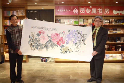 ??? △張文峰會(huì)長(zhǎng)(右)代表廣東省僑界作家聯(lián)合會(huì),接受廣東省僑界作家聯(lián)合會(huì)顧問、印尼《千島日?qǐng)?bào)》榮譽(yù)副社長(zhǎng)兼廣州辦事處主任李偉輝先生(左)代表《千島日?qǐng)?bào)》贈(zèng)送的畫作。?